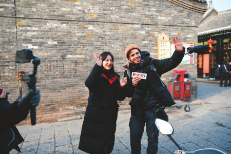 龍祥鳳瑞迎新春、龍躍鳳舞鬧新春、龍章鳳彩賀新春,熱鬧的平遙中國年吸引不少外國友人來打卡,吃美食、看文化、當回“晉商少奶奶”。“平遙古城歷史悠久,是曾經的‘中國華爾街’,在全世界都非常著名,晉商票號讓人感到震撼。”臘月廿七中午,剛剛結束山西大同行程的葡萄牙游客Joao與哥哥來到平遙古城。Joao是一位中國歷史愛好者,談起腳下的平遙古城連連豎起大拇指,“我們特意把平遙的旅程放在春節這段時間,要轉轉古城的歷史遺跡,還要看看古城的特色演出,感受一番地道的中國年。”