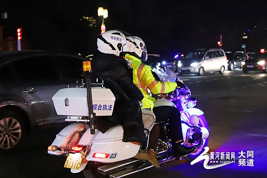 在人流如織的古城街頭,大同平城區鐵騎隊員們日夜堅守,全時段管理,快速、便捷排查轄區內各主次干道及重點區域的死角、盲區,疏導攤點,規范非機動車停放,幫助前來求助的旅客與市民,做到了城市管理“不打烊”,“城管藍”春節不斷檔。