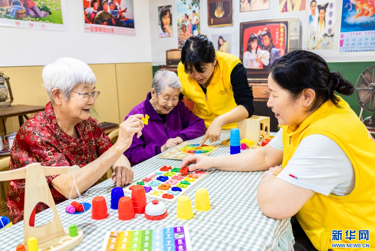 4月8日,工作人員在呼和浩特市玉泉區居家社區養老服務標準化示范中心陪老人玩益智游戲。新華網發(丁根厚 攝)