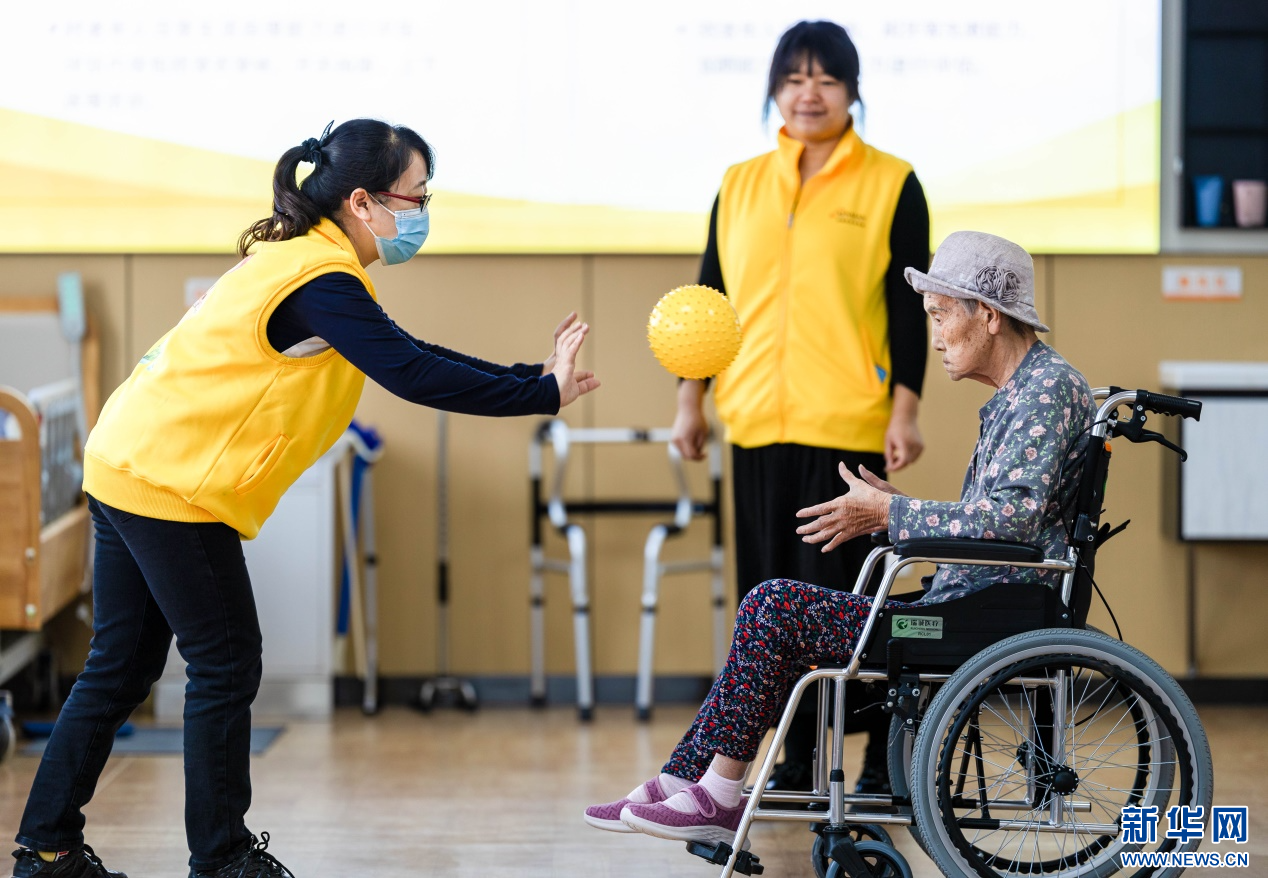 4月8日,工作人員在呼和浩特市玉泉區居家社區養老服務標準化示范中心陪老人做游戲。新華網發(丁根厚 攝)