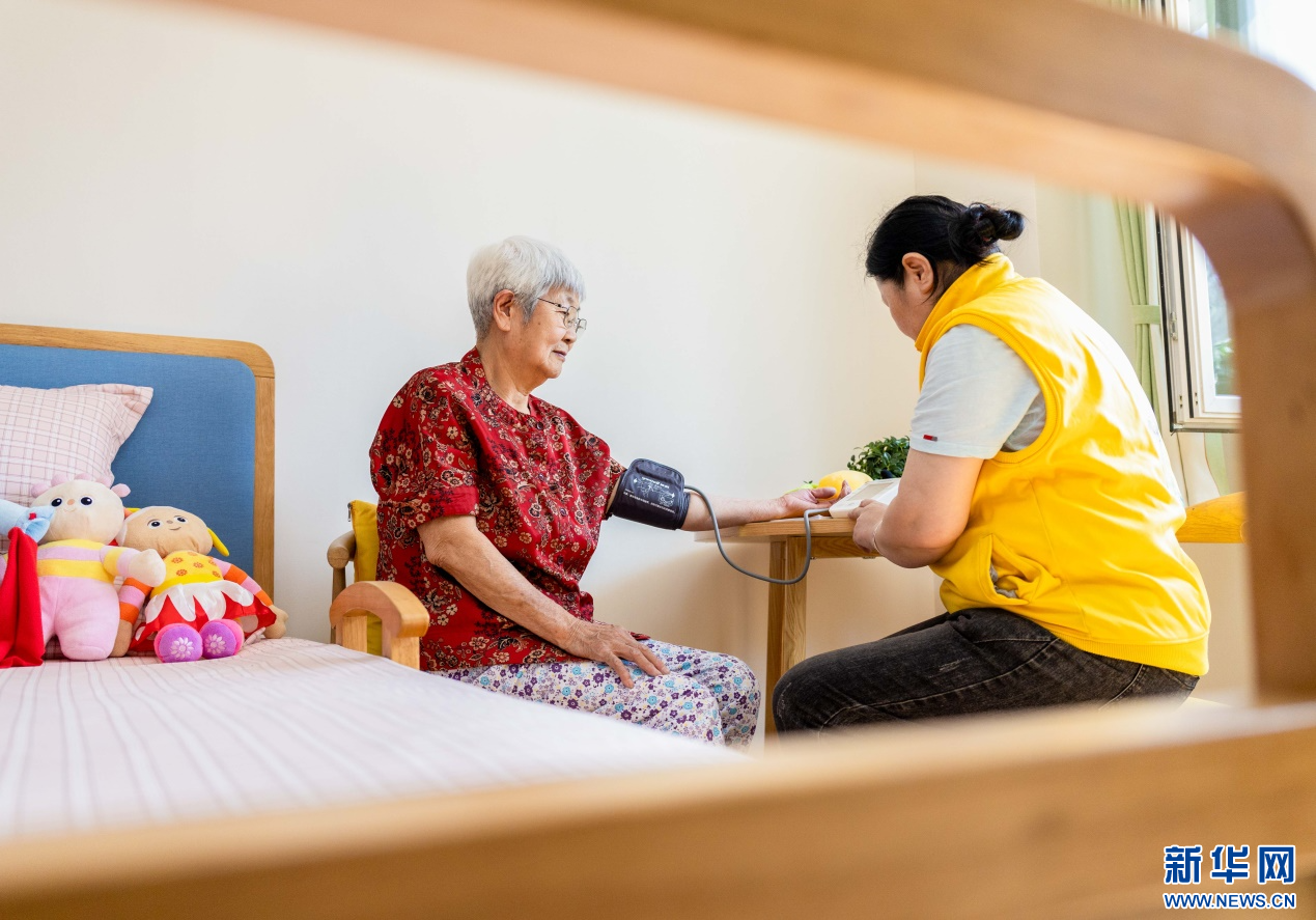 4月8日,工作人員在呼和浩特市玉泉區居家社區養老服務標準化示范中心為老人量血壓。新華網發(丁根厚 攝)