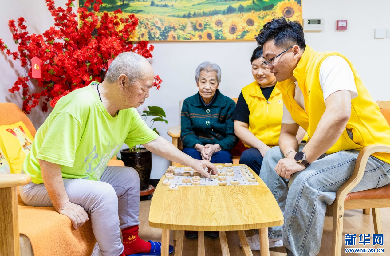 4月8日,工作人員在呼和浩特市玉泉區居家社區養老服務標準化示范中心陪老人下象棋。新華網發(丁根厚 攝)