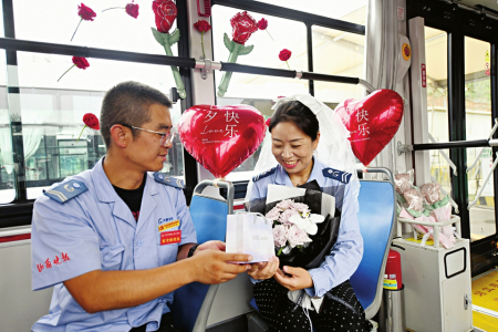 另一對公交夫妻是今年同為39歲的焦更新和李靈,均是812路公交車駕駛員,他們倆是初中同學,當天還是他們結婚第17年的紀念日。一大早,焦更新就來到車隊,布置車廂,等著妻子的到來。“老婆,結婚紀念日快樂!也祝你七夕快樂!”李靈看著鮮花和禮物很是驚訝,走到布置好的車廂后,更是紅了臉。“真沒想到今年的結婚紀念日能收到這么大的驚喜,鮮花、浪漫的車廂,還有化妝品,很開心很感動,感謝老公的這份愛意。在工作中,我會把這份愛意傳遞給更多的乘客。”有著12年駕齡的李靈,是一名五星級駕駛員,她在提升駕駛技術和服務等方面很是鉆研,工作中還有自己的很多創新,在車廂布置“便民袋”,放上地圖、問候乘客的手繪海報等,細微的服務打動了很多乘客,她把車廂當成自己的家一樣呵護。