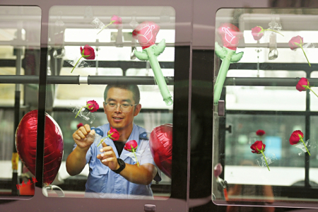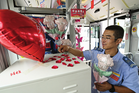 七夕節即將到來,8月8日,在太原公交第三汽車分公司,公交車廂里上演了一場別樣的浪漫——堅守在一線的兩名公交司機閻樹德和焦更新,分別為出車回來的妻子準備了大大的驚喜。用送花、提前準備飯菜、布置車廂等行動表達自己的愛意。