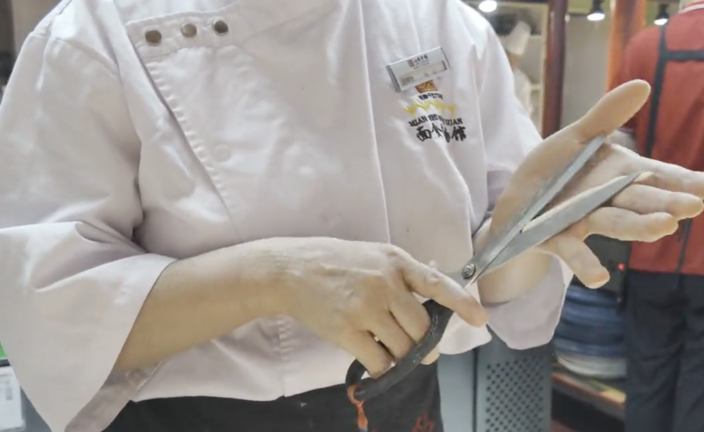 圖為夾心面。新華社記者 王怡靜 攝??關(guān)于剪刀面的故事很動人——“‘剪子面,兩頭尖,吃到肚里胃不酸’。相傳剪刀面是以前喬家大院的喬貴發(fā)走西口的時候,留在家里的妻子為丈夫裁剪衣服,由于過于思念丈夫,一走神就把剪刀也帶到了廚房里,于是便有了剪子面。‘胃不酸’,其實(shí)也是‘心不酸’。”李琨說。剪刀面一般用來做湯面,配蔬菜吃,也有著希望家人安康的寄托。