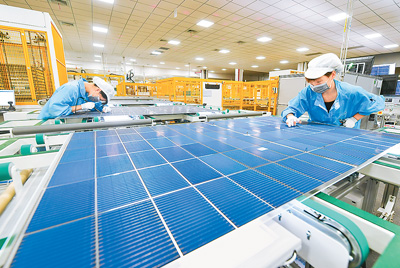 圖為安徽華晟新能源科技股份有限公司的異質結光伏電池及組件工廠內,技術人員在對產品進行檢測。徐 勇攝(新華社發)