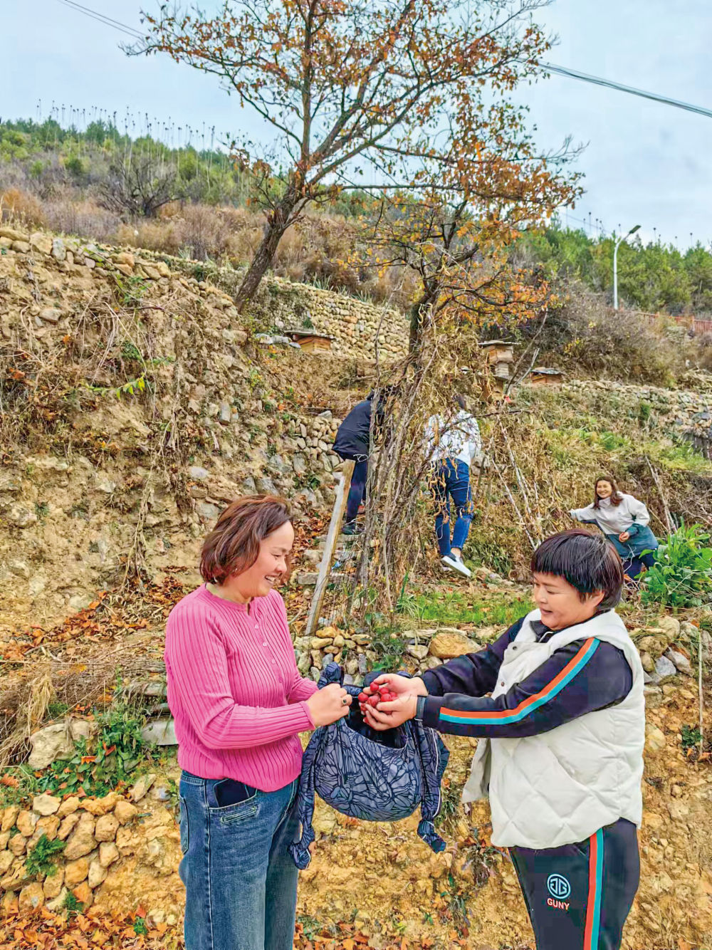 在松廟村的山坡上,一大早就從河南新鄉市長垣市自駕車過來的馬女士(右)和朋友們一起采摘野生的山楂果子,她們每年夏天都要在這里小住幾天避暑。新華每日電訊記者 趙東輝 攝。
