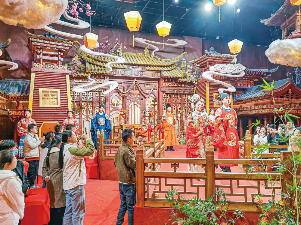 現在村里不僅可以提供周、漢、唐、宋、明等不同禮制的中式傳統婚禮服務,景區日常還上演著迎賓禮、出閣禮、正婚禮等表演,讓客戶下單前就可以提前審視自己婚禮的效果。部分古民居經過修繕裝修開設的民宿,還分成了“男方院”“女方院”,方便全套迎親流程在這里展開。