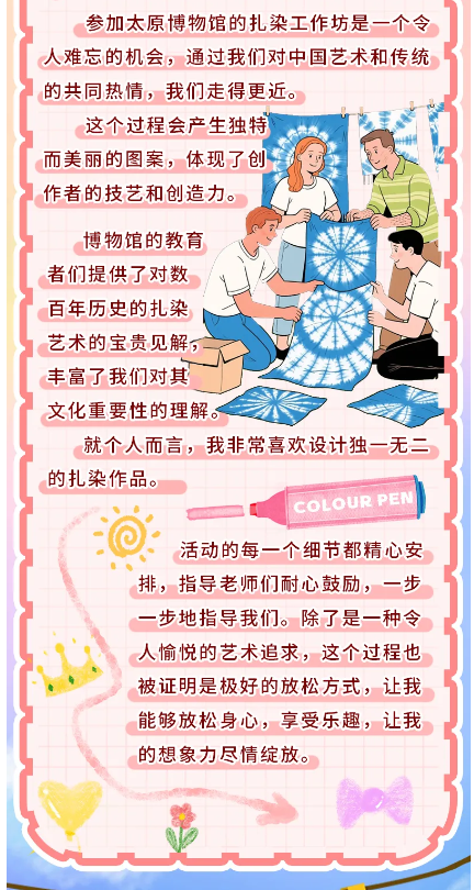 隨著國(guó)際博物館日臨近,太原市博物館開(kāi)展聯(lián)動(dòng)中外的“流動(dòng)博物館”主題活動(dòng),來(lái)自太原科技大學(xué)國(guó)際教育學(xué)院近30名不同國(guó)家的留學(xué)生,參與中國(guó)非遺扎染技藝工作坊。 國(guó)際青年們認(rèn)真聆聽(tīng)扎染的歷史淵源與工藝精髓,并通過(guò)分步演示,親自體驗(yàn)“絞纈”技法。留學(xué)生們?cè)谒厣浇砩险郫B、捆扎、浸染,創(chuàng)作出各具特色的紋樣。 讓我們一起來(lái)看看國(guó)際青年的“扎染”日記吧~
