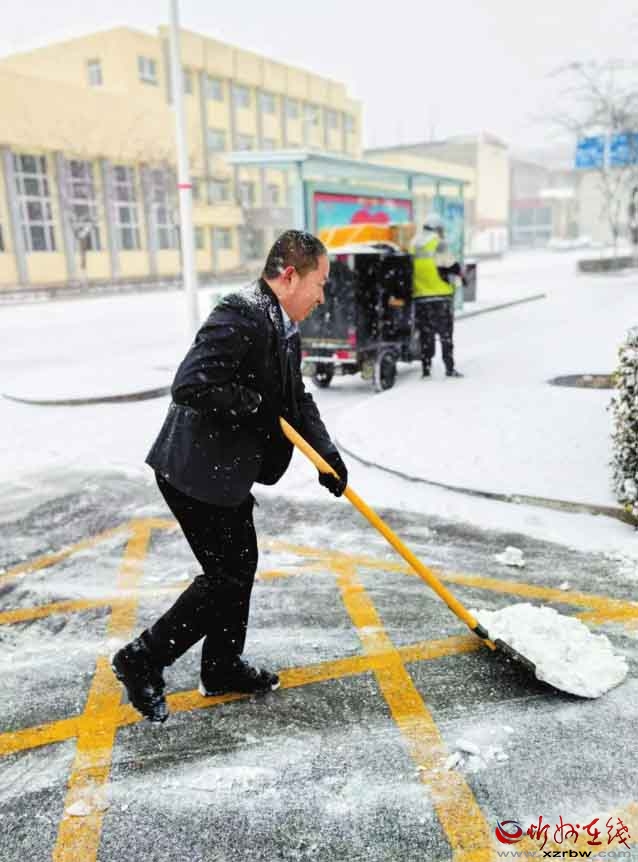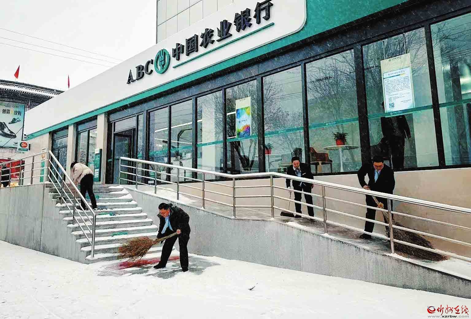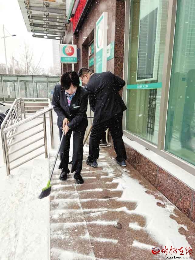 面對我市首場強降雪,農行忻州分行員工以雪為令,及時清掃網點及周邊區域,確保服務通道暢通無阻,以實際行動傳遞了溫暖的金融服務。(殷俊攝)