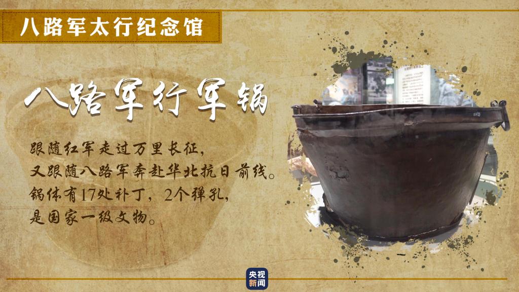△八路軍行軍鍋 一口行軍鍋,跟隨紅軍完成了兩萬五千里長征,又跟隨八路軍東渡黃河開赴華北抗日前線。 1938年春,村民李煥蘭的丈夫發現一名八路軍戰士,滿身鮮血,懷里還抱著一口行軍鍋。他臨死前對李煥蘭的丈夫說:“這口鍋從長征到現在跟隨我好多年。過草地、煮草根皮帶,救活過戰友,我實在不忍心把它丟掉。” 1939年10月,李煥蘭把這口鍋捐贈給駐扎在村里的八路軍。鍋身上有17個補丁,早已銹跡斑駁。 彭德懷副總司令聽說了鍋的來歷后,說道:“這口鍋彈痕累累,為抗日戰爭的勝利立下汗馬功勞。待到全國解放后,一定要把它請到博物館,讓后人知道中國的革命歷程是何等艱難,何等曲折。”