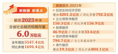 數據顯示,2023年,投放實體經濟貸款增加4201.2億元,同比多增792.2億元,支撐力度依然穩固;企業債券凈融資150.3億元,同比多增156.9億元;股票融資46.9億元,同比多增33.6億元;政府債券凈融資794.7億元,與上年基本持平;表外融資增加19.3億元,同比少減804.1億元。