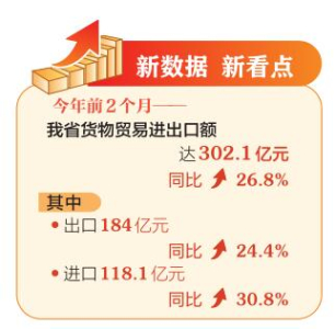 在去年同期低基數、重點企業延續增長態勢、多個重點商品大幅增長的疊加影響下,今年前2個月全省外貿實現大幅增長,新增長點不斷涌現。出口商品中,手機及零件、軌道交通裝備和煤炭是拉動出口增長的主要因素;進口商品中,集成電路、各類金屬礦砂、煤炭是拉動進口增長的主要因素。