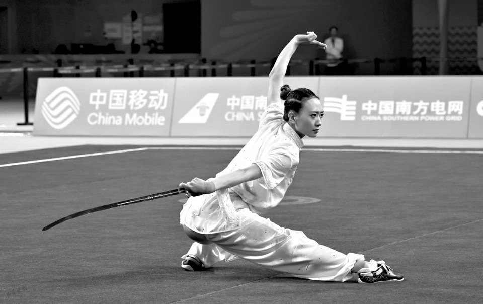 下午的劍術比拼,姚洋白衣執劍,氣質出眾。她在比賽中騰空、跳躍,劍隨身走,銀光閃動中盡顯劍術的靈動與俠氣,落地時又穩如磐石,再度斬獲9.830分,繼續領跑全場。