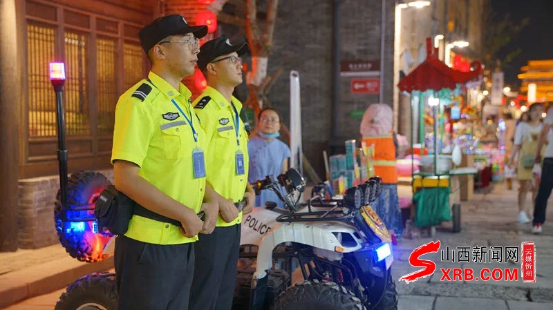 夜幕下的古城,華燈初上,忻府公安的警燈分外閃亮,巡邏民警穿梭在人群中,守護在群眾身邊,用最短時間、最快速度處理群眾緊急求助、處置各類突發警情,確保警力24小時不缺位,全力以赴守護景區和游客安全。(劉潔)