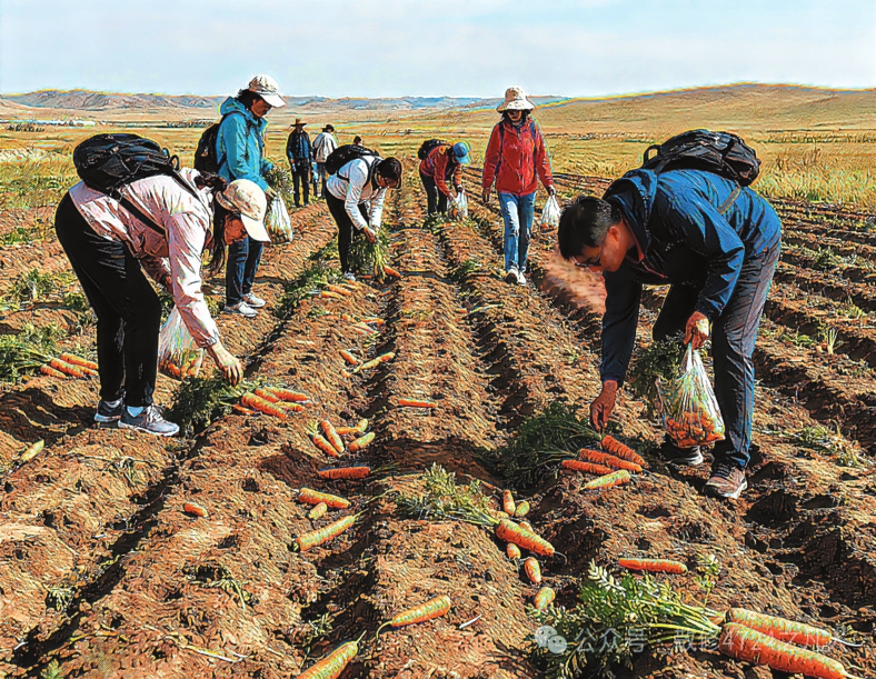 “撿秋”游演繹著“鄉土中國”的現代篇章。費孝通在《鄉土中國》開篇即言“從基層上看去,中國社會是鄉土性的”。這種“鄉土性”的核心是人與土地的深度綁定。農民靠土地生存,土地是文化認同的根基?!皳烨铩边@種農耕活動,如今以更加鮮活方式延續下來。對農民而言,土地不僅是謀生手段,更是安身立命的“精神原鄉”。而城市游客的參與則賦予了“撿秋”新的意義。在城市里待久了,就想蹲在田里感受泥土的溫度,游客“撿秋”體驗的是“春種秋收”踏實感。這種體驗式參與是現代人對鄉土文明的“情感反哺”。游客們彎腰的身影既是對土地的致敬,也是對“根”的追尋。他們未必真懂農事,但通過參與“撿秋”完成了對鄉土文化的認同,被撿起的“果實”從“生存作物”演變為“文化媒介”。當前,內蒙古各地推出的挖土豆、烤土豆等旅游項目是對鄉土資源的文化再“編碼”,當土豆從田間走向游客的后備箱,“鄉土中國”便獲得了更加豐富的表達。