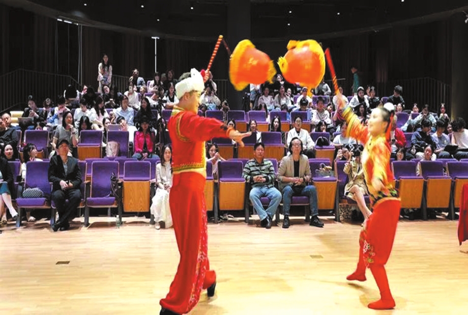 活動現場,藝術團團長劉延鳳作為主講人,將黃河岸邊的千年回響娓娓道來。她從“戶有弦歌新治譜”的記載,講到被列入國家級非遺的榮光;從高亢遼闊、自由奔放的“山曲”風味,解析融合三省民間音樂元素的“二人臺”小戲的獨特魅力。多位優秀演員聯袂登臺,他們用精湛的技藝將這份厚重的文化遺產鮮活呈現。市級非遺代表性傳承人鄔光演唱的《放羊漢唱起爬山調》,一聲出口,仿佛將黃土高原的溝壑縱橫與黃河的奔騰不息盡數帶到現場;優秀青年演員王佳、楊慧、鄔強等演繹的《河曲人愛把山曲唱》《打藍靛》《壓糕面》等多首河曲民歌二人臺的經典曲目與劇目,展現了民間生活的喜怒哀樂,濃郁的鄉土氣息與真摯情感深深打動了在場師生。