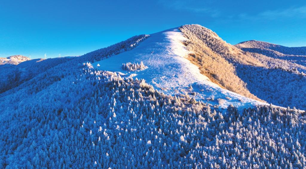 冬之凈,返璞歸真的意蘊。當一場大雪如期而至,金山梁便徹底沉靜下來,進入一個冰雕玉砌的童話世界。梁頂之上,積雪平整如鏡,宛如瓊瑤鋪地,反射著清冷而純粹的日光。而當陽光突破云層,照射在冰面上,則光芒閃耀,令人不敢直視。松枝上堆滿了蓬松的積雪,傲立于山崖,盡顯在嚴酷中堅守的堅韌品格;山間那些奇形怪狀的巖石,覆上白霜后,更是空蒙清靈,意韻悠長。生命的痕跡并未完全消失,偶有野兔為了覓食奔躍而過,在雪地上留下一串輕盈的足跡,但轉瞬便被新雪覆蓋,似乎了無痕跡;時有耐寒的鳥兒掠崖飛去,翅羽間振落的冰晶,在空中劃出一道優美的弧線。