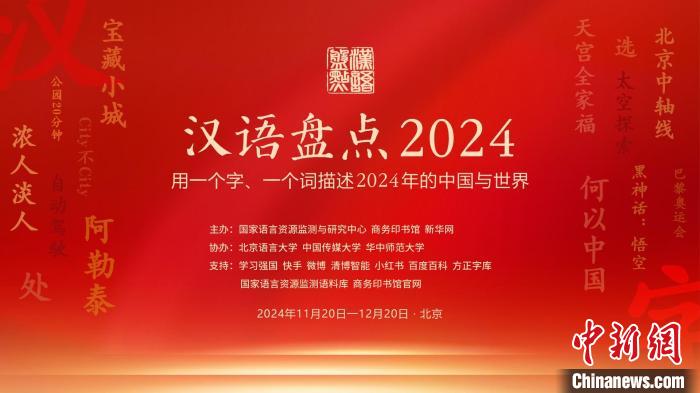 由國家語言資源監測與研究中心、商務印書館等聯合主辦的“漢語盤點2024”20日在京啟動,“用一個字、一個詞描述當年的中國與世界”,鼓勵全民用語言記錄生活,描述中國視野下的社會變遷和世界萬象。