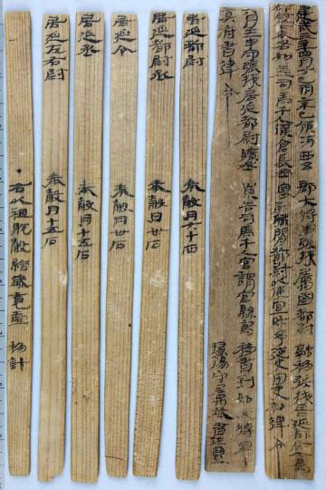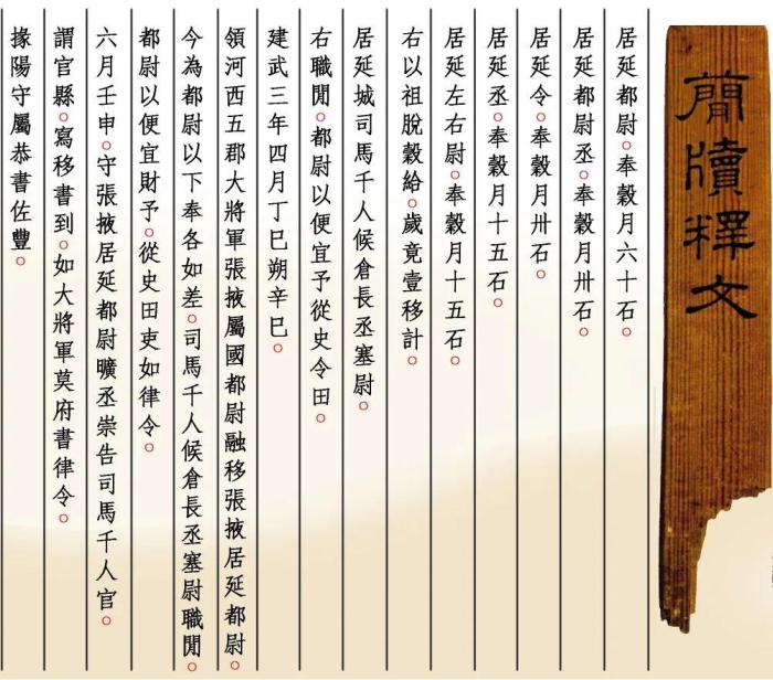 “建武三年四月丁巳朔辛巳,領河西五郡大將軍張掖屬國都尉融移張掖居延都尉,今為都尉以下奉各如差,司馬千人候倉長丞塞尉職閑,都尉以便宜財予,從史田吏如律令……”出土于內蒙古額濟納旗甲渠候官遺址的《建武三年居延都尉吏奉例》由10枚簡組成,每簡長22.8厘米,前兩簡寬2.5厘米、其余8簡寬1.4厘米,全文200字。