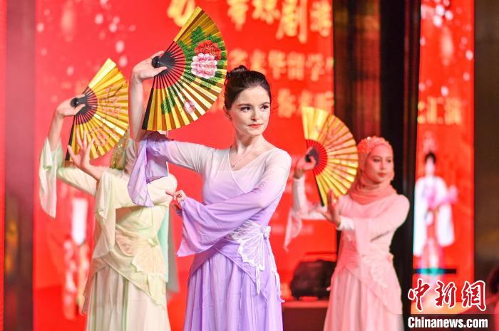 1月22日晚,海南省來華留學生“瓊韻華章之瓦唱瓊劇、你來聽”非遺匯演在海口舉行,外國留學生表演折扇舞。 肖若洋 攝