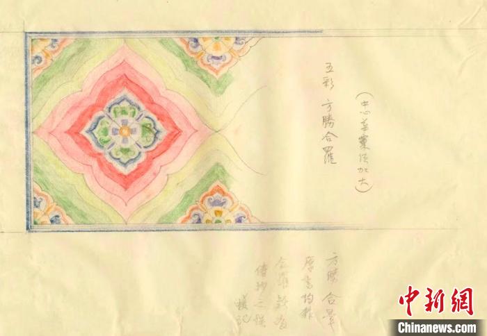 5月27日,“彩畫千年——中國官式彩畫傳承與創新展”在故宮博物院永壽宮展廳正式對公眾開放。圖為梁思成手繪的宋代五彩方勝合羅(復制品)。(故宮博物院供圖)