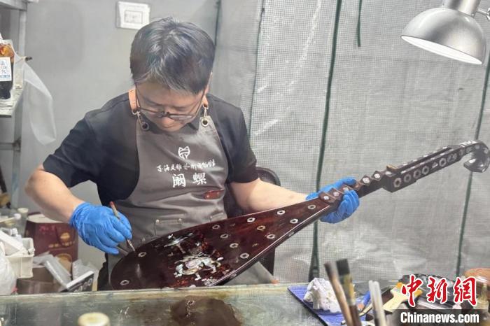 中新網溫州6月17日電(周健 瀟瑜)浙江溫州洞頭素有“百島之縣”“東海明珠”的美稱,得天獨厚的海洋資源孕育出各種貝類。近年來,當地的貝雕非遺工坊依托洞頭貝雕與溫州螺鈿兩項浙江省級非物質文化遺產代表性項目,走出了一條特色鮮明的強縣富民之路。 而這背后,離不開工坊負責人陳燦淵、葉晶晶這對夫妻的經營。陳燦淵熱衷復刻文物,葉晶晶則喜歡鉆研將貝雕工藝與時尚接軌。他們在非遺傳承的道路上共同編織出美麗故事,讓歷史經典產業煥發出新活力。 步入陳燦淵的工作室,只見他正忙碌地為一把琵琶涂上大漆。“這是一把即將完成復刻的唐代五弦琵琶,此次復刻工作突破了傳統的平面裝飾,采用了立體浮雕技術,在琵琶的面板、背板、琴頭等關鍵部位嵌入了螺鈿圖案。螺鈿的制作過程極為復雜,從挑選合適的貝殼開始,到切割、打磨、雕刻,每一步都要求極大的耐心和精湛的技藝。”