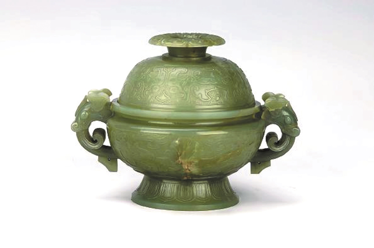 這件清代的獸面紋玉奩,高12.5厘米,口徑11.1厘米,底徑8.2厘米。青玉質地,器物以整塊青玉為材料制作,圓形,由上下兩部分組成,高圈足。上面為奩蓋,下面為奩身。奩蓋看上去就像一只倒扣的大碗,釉面光潔,圓潤自然;蓋頂為空心,雕刻仰蓮瓣紋,蓋面雕刻獸面紋,紋飾細膩生動。奩身與奩蓋相扣合,頸部兩側相對稱地各鏤雕獸首耳一只,分別與奩腹下相接。腹部滿浮雕獸面紋。圈足外一圈凸雕仰蓮紋,隨器形伸展,充滿動感,讓人心生聯想:若是將之置于水中,一定頗有幾分清人汪懋麟筆下“玉奩亂潑脂水濃,春波半濺青裙濕”的意趣之美。(李笙清)