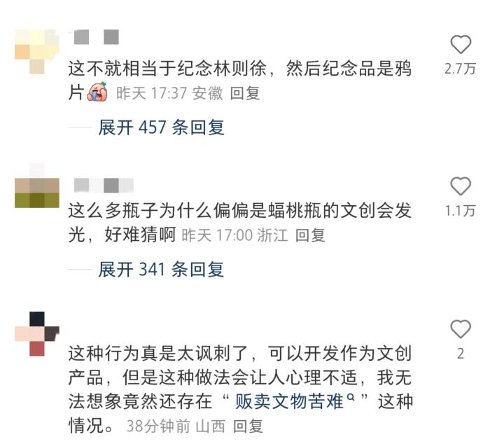 網友評論。社交媒體截圖 網友的評論,反映出公眾對該設計的強烈不適感。這款承載著“文物歸鄉”意義的文創產品,卻因設計細節被指“消費歷史苦難”。 針對此事,中新網記者致電上海博物館。“這個之前已經有反饋了。目前還在處理……今天已經來過好幾個電話了。”工作人員證實,此前已多次收到關于此款文創冰箱貼的公眾反饋,上博內部也在討論此事。關于后續處理結果,工作人員表示“之后如果處理好了會公布”,但將以何種形式公布,“目前還沒有通知”。 當記者進一步詢問該爭議文創產品是由上海博物館自主開發還是與其他主體合作,以及設計環節由誰把控時,工作人員答復:“這個我們也不清楚。” 目前,上海博物館方面已關注到公眾對此款文創產品的質疑聲音,并啟動了內部討論程序。關于該產品的設計背景、責任歸屬以及最終處理方案,仍有待館方進一步的信息披露。 中新網評:文創開發不應調侃傷痛歷史 文物不僅是藝術載體,更承載著時代印記與民族情感。 文創開發本是讓文物“活起來”的重要途徑,但這種“活化”源于對文物內涵的深度挖掘,若忽視了對歷史的敬畏之心,便容易引發公眾的情感抵觸。蝠桃瓶從“燈座”到“藏品”的轉變,本是一個“文物回家”的勵志故事,但過度強調、甚至調侃其被改造的“屈辱史”,反而消解了文物回歸的象征意義。