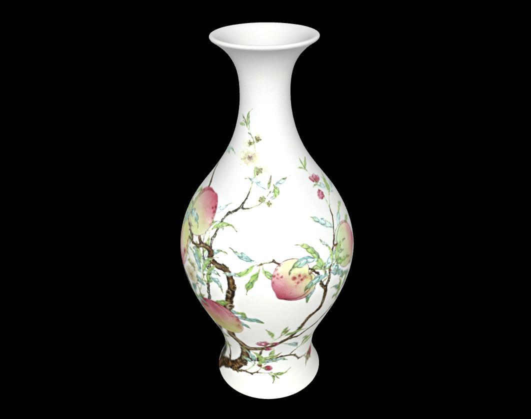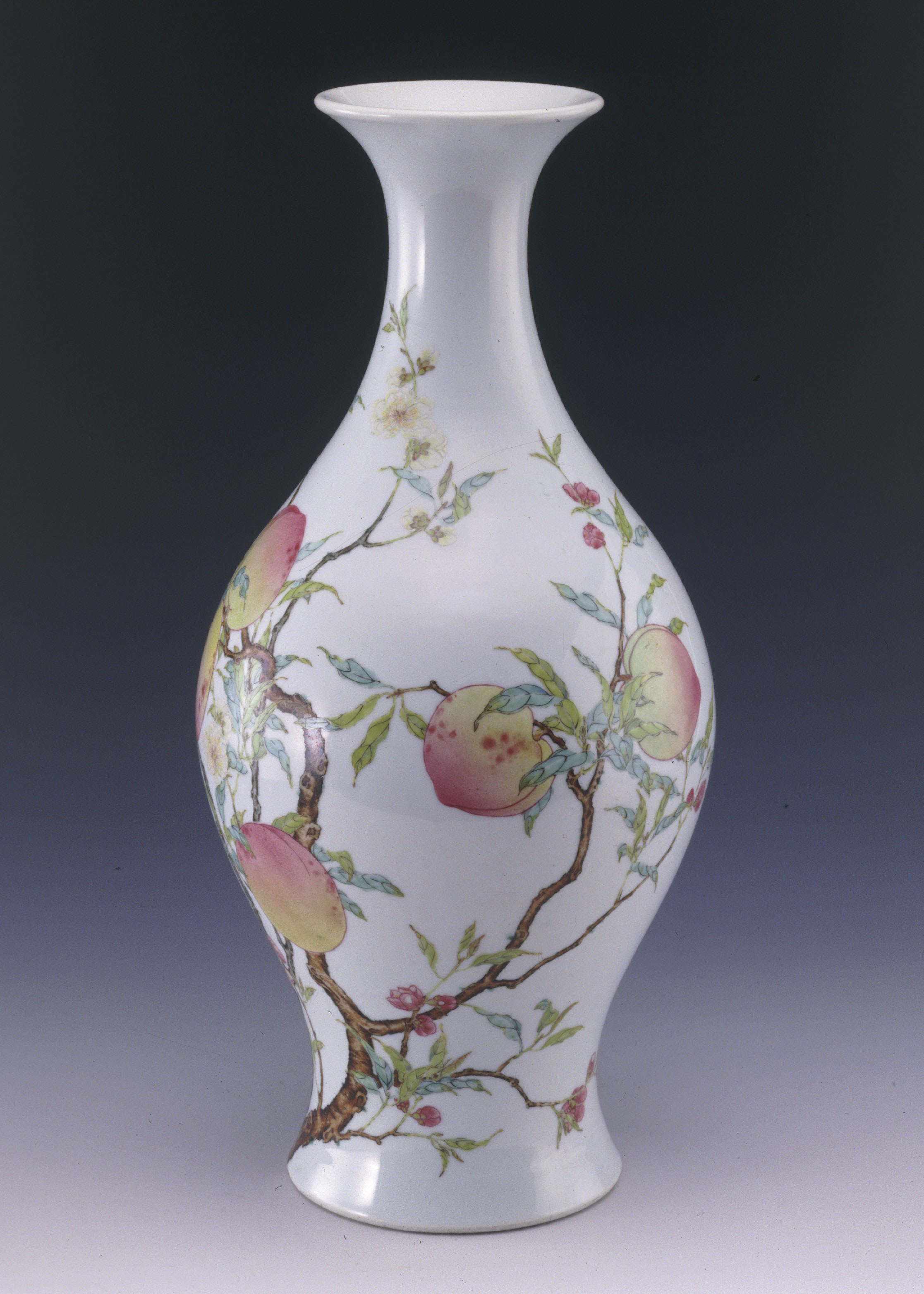 清雍正粉彩蝠桃紋橄欖瓶。圖源上海博物館官網 據奧格登回憶,在那個年代,美國家庭流行將花瓶底部鉆孔改裝成燈座。雖然蝠桃瓶底部“慶幸”未被鉆孔,但也曾一度淪為燈座,放置在客廳的茶幾之上。為增強其穩定性,瓶內還加入了奧格登家后花園伴著狗糞的沙泥,長達40年。