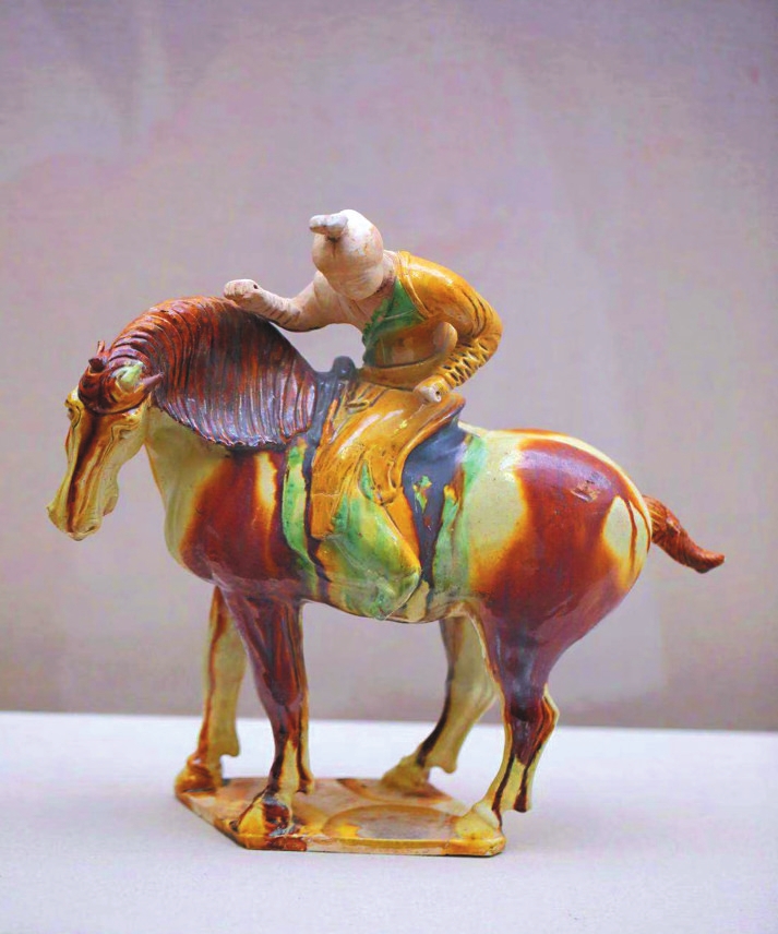 唐代女子也熱愛打馬球,《明皇擊球圖》展現了唐玄宗與后宮妃嬪打馬球的場景,河南洛陽唐代王雄誕夫人魏氏墓曾出土四件三彩打馬球女俑。唐代詩文中也有女子打球的記載,王建《送裴相公上太原》中寫“千群白刃兵迎節,十對紅妝妓打球”,張籍的《寒食內宴二首》亦云“廊下御廚分冷食,殿前香騎逐飛球”的詩句。由于馬球運動的流行,唐代有很多與馬球相關的文物,流傳至今的馬球、球桿、球場碑石、繪畫、泥塑等數不勝數。
