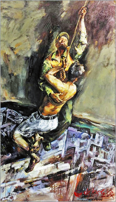 作品《空中救援》中,觀者首先感受到的就是難度。主題表現(xiàn)的事件難度和畫面表現(xiàn)處理的難度交織在一起,讓我們在驚險、焦急的心理壓力下感受到生命的脆弱。空中救援成了生命的唯一通道。救援同樣是險象環(huán)生、驚心動魄。從畫面處理技巧上是一種挑戰(zhàn),天空與地面的透視關(guān)系,動感與靜態(tài)的對立統(tǒng)一,那種命懸一線的緊迫感對心理的沖擊力,通過大刀闊斧的刮刀、筆觸處理,和蒼涼緊迫的色調(diào)關(guān)系,準確地展示了主題思想,大膽省略了一些不必要的細節(jié)描寫。用大筆觸、大色塊表現(xiàn)背景的壓抑和險峻,救援主體成為沖破這一重壓的希望之色。沒有去刻意刻畫天與地的真實場景,簡潔概括但不呆板空洞,這種果斷的駕馭,是續(xù)鶴賢真實實力的體現(xiàn)。 邢晨聲 文