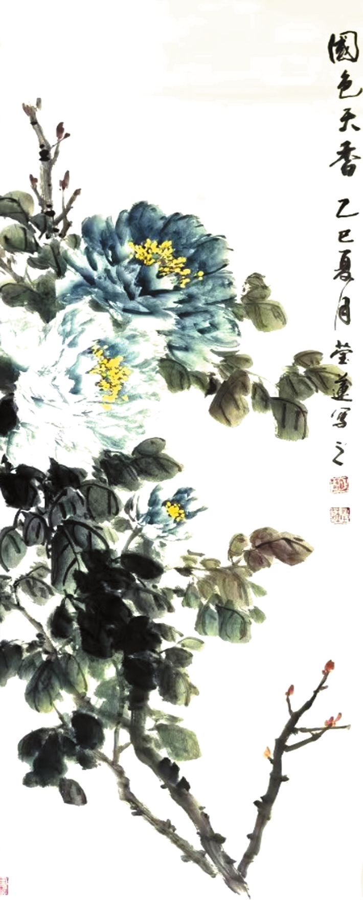 胡瑩蓮的筆墨并非刻意炫技,而是循著“應物象形”之理自然生發:牡丹花瓣以淡彩層層暈染,輔以墨線勾勒輪廓,既顯牡丹的華貴之姿,亦存筆墨的清勁骨力;紫藤枝條以側鋒揮掃而出,既有“折釵股”般的圓勁質感,亦見藤蔓的靈動意趣。恰如北宋畫家郭熙在《林泉高致》中所言的“筆補造化”,胡瑩蓮以筆墨為媒介,貫通物象的自然本真與人文意蘊。