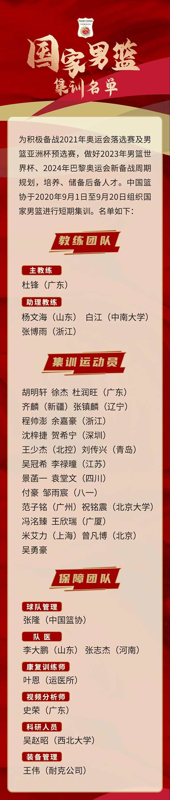 人民網北京8月26日電(郝帥)為積極備戰2021年奧運會落選賽及男籃亞洲杯預選賽,做好2023年男籃世界杯、2024年巴黎奧運會新備戰周期規劃,培養、儲備后備人才。中國籃協于2020年9月1日至9月20日組織國家男籃進行短期集訓,名單今日出爐。