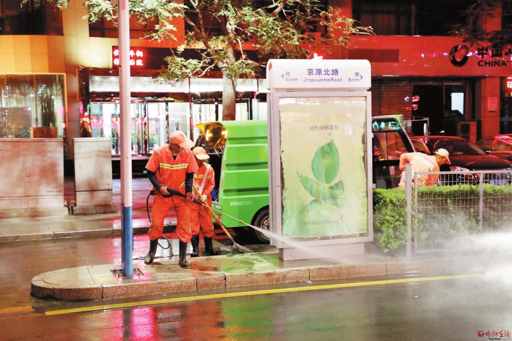 九月九日晚,原平市環衛工人利用晚上路上人少車少的有利時機,清洗京原北路的道路死角。 本報通訊員 攝