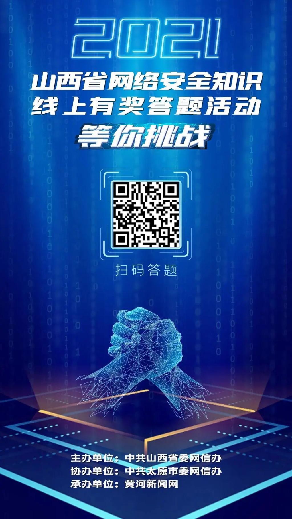 為深入宣傳貫徹《中華人民共和國網絡安全法》等相關法律法規,進一步普及網絡安全知識,提升全社會網絡安全意識和防護技能,在2021年國家網絡安全宣傳周期間,由中共山西省委網信辦主辦、中共太原市委網信辦協辦、黃河新聞網承辦的“2021山西省網絡安全知識線上有獎答題活動”于10月9日正式啟動。