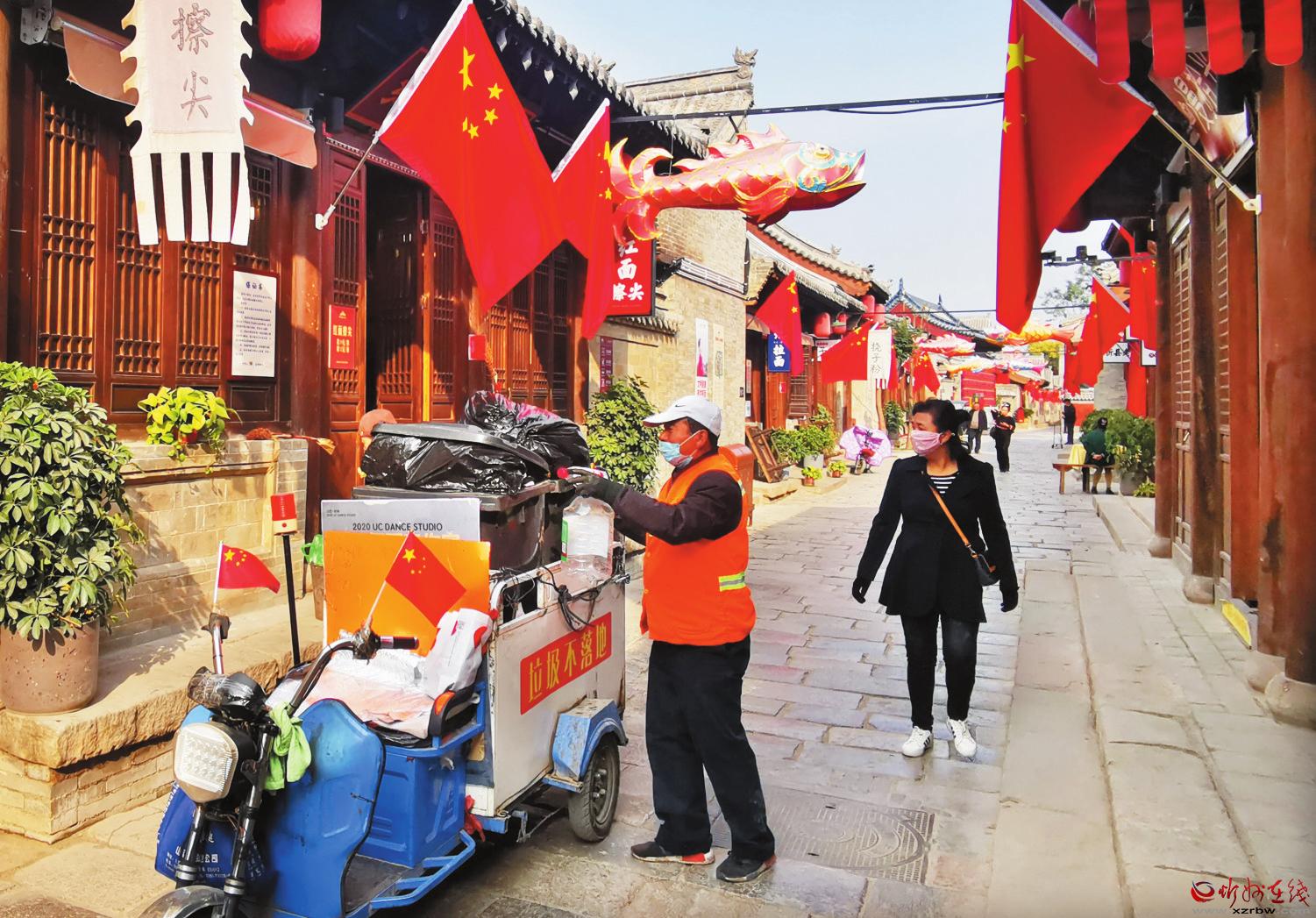 10月14日,忻州古城的環衛工人正在上門收運沿街商戶產生的垃圾,保證日產日清,垃圾不落地。(張存良 攝)