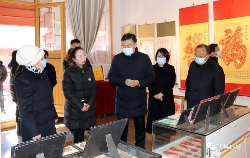 在代縣非物質文化遺產展廳,李建國先后參觀了楊氏古建、望臺磚雕、雁剪閣、雁晶刺繡、藍花工作室、華嚴藝術世界、天順昌泥塑、曉玲面塑、葉玲瓏和雁繡坊等展廳。李建國與從業藝術工作者親切交談,希望他們不斷淬煉技藝,進一步提升產品藝術價值,研究消費對象的需求,借鑒南方和其它非遺研發發達地市的先進經驗,將產業做得更大更強。