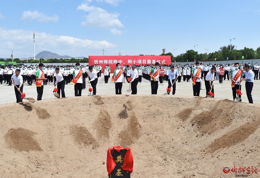 市領導為忻州師院附中、附小校區建設項目培土奠基。馮曉磊 攝 開工儀式后,朱曉東、李建國等市領導相繼為國道108線改建工程項目和忻州師院附中、附小校區建設項目培土奠基。
