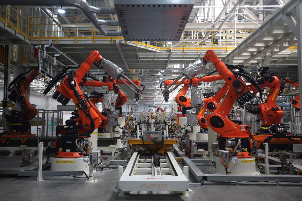黃色的機械臂上下揮舞,無人搬運車穿梭不停,焊裝線火花四濺,配備了高精度傳感器和先進機器視覺系統的焊接機器人正在精準焊接車身部件……