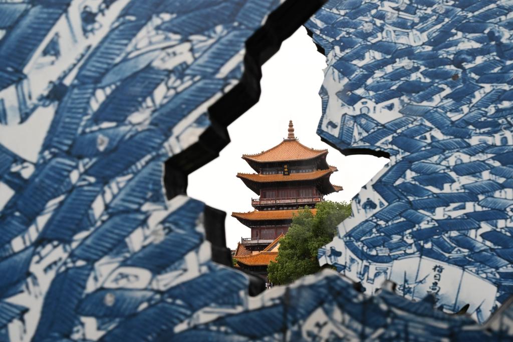 透過創意青花瓷片拍攝的龍珠閣。新華社記者 隋尚君 攝