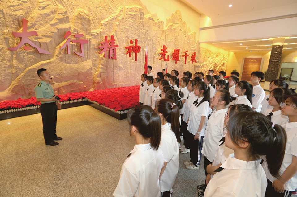 八路軍太行紀念館的講解員正在給學生們講解抗戰故事。