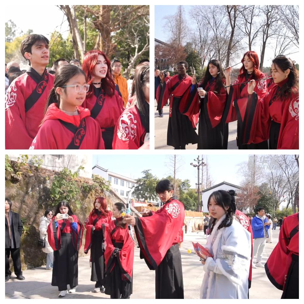 春節期間,來自浙江師范大學的10多位留學生在浙江金華參加了“我在中國過春節”的體驗項目。他們身著漢服,到金華府文廟,向孔子像行拜師禮,并在新年祈福牌上書寫新年愿景。