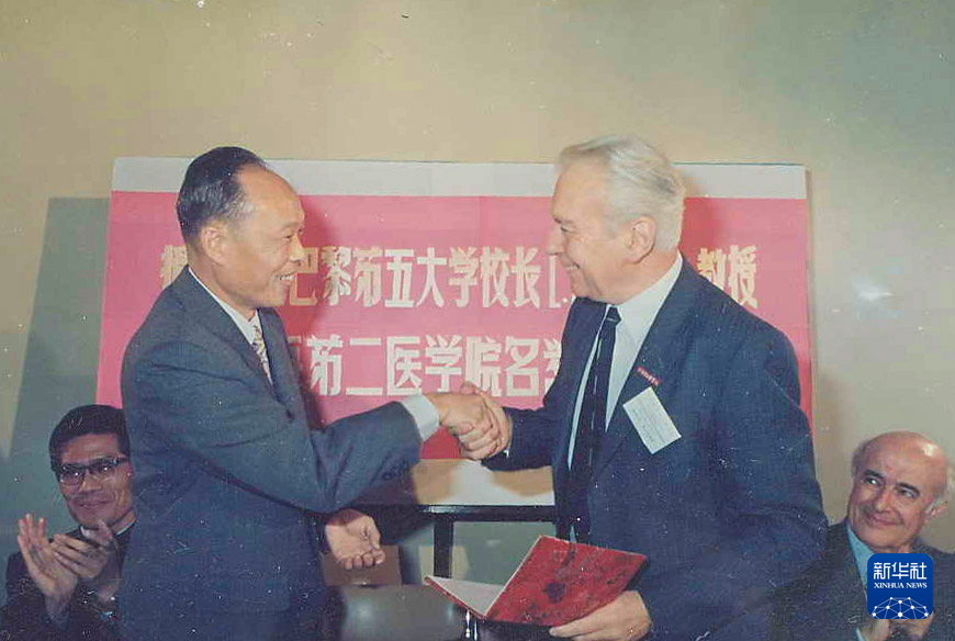 上海第二醫學院(現上海交通大學醫學院)校長王振義(前左)授予法國巴黎第五大學校長歐基埃名譽教授稱號(攝于1985年)。新華社發(上海交通大學醫學院供圖)