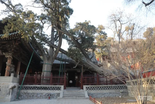 三千年晉祠的“見證者”——周柏。周柏長于圣母殿右側,18米長的周柏向南傾斜生長,被另一株古柏所支撐,樹葉披覆在圣母殿頂,樹干粗壯,得幾人才能合抱,像一條橫臥的巨龍,因此有“臥龍柏”之美譽。經科學測定,此樹已有二千九百九十多歲。在晉祠,樹齡在千年以上的蒼松、翠柏、古槐等尚存二十余株,它們和古柏一起見證著晉祠的悠悠歷史。