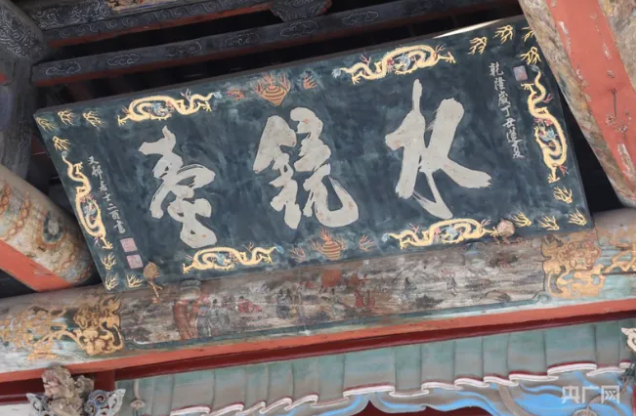 “水鏡臺”匾。水鏡臺是一座古戲臺,懸掛匾額“水鏡臺”。“水鏡”之名取自《漢書》名句“清水明鏡不可以形逃”,寓意為人世間的善惡忠奸盡人皆知。此匾由清乾隆翰林、著名書法家楊二酉所題,書體清秀,筆力遒勁。